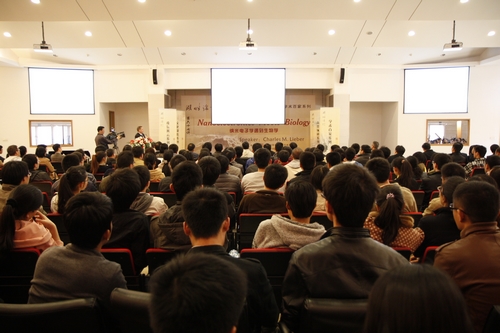 讲座中,Lieber 教授与大家分享了他的最新研究工作进展:使用核壳结构的Ge/Si纳米线构建了纳米逻辑与非门电路,向3D纳米处理器的研发前进了一步;构建了P/PIN核壳结构Si纳米线太阳能电池,实现了高光电转换效率;将纳米电子学器件应用于生物领域,使用纳米探针探测细胞内部的电学和生物化学信号,以及无缝整合纳米电子学器件和合成生物组织。