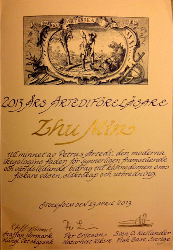 阿特迪讲座第三期于4月23日在斯德哥尔摩瑞典皇家科学院开讲,中国科学院古脊椎动物与古人类研究所朱敏应瑞典皇家科学院之邀作了题为“中国远古鱼类揭示有颌脊椎动物起源与早期演化”的精彩报告。报告介绍了中国南方志留纪—早泥盆世发现的系列鱼类化石,这些早期鱼类化石所具有的出人意料的特征组合,为阐明早期有颌脊椎动物以及早期硬骨鱼类的特征演化顺序提供了关键实证,揭示了脊椎动物演化主线上颌起源、硬骨鱼类起源及硬骨鱼类谱系分化等重要演化事件。
