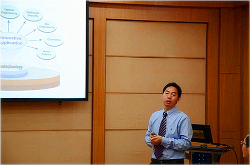 陈国防博士作了题为Stimuli-Response Polymeric Fragmented Nanotubes for Controlled Drug Delivery in Cancer Treatment的学术报告。报告中,陈国防主要介绍了新型聚合物纳米管材料在可控的靶向抗癌药物输送中的应用。他们在研究中发现通过加入适当比例的二甲基丙烯酸乙二醇酯(ethylene glycol dimethacrylate, EGDMA)交联剂,利用光引发的聚合反应促使甲基丙烯酸缩水甘油酯(glycidyl methacrylate, GMA)单体形成对温度和pH敏感且外表均一、具有一定机械强度的聚合物纳米管;并利用超声方法以及活化的靶向配体——叶酸对纳米管进行改造和修饰,制备聚合物纳米管主动靶向系统,研究了其生物体外抗癌药物的缓释行为。相关研究成果已经发表在Colloid and Polymer Science, Journal of Nanomaterials, Journal of Materials Chemistry等SCI专业期刊上。