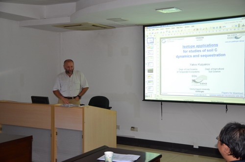 期间,Kuzyakov以Isotope applications for studies of soil C dynamics and sequestration为题详细讲解了同位素技术在土壤碳循环研究中的应用,并举例分析了利用碳同位素的自然丰度、连续、脉冲标记技术方法在土壤碳循环研究中的应用及其优点和局限,指出了同位素技术是目前为止追踪有机碳来源、土壤微生物对“新碳”、“老碳”利用等方面最有效的手段之一。徐兴良、Anna分别作了题为Nitrogen acquisition strategies by plants和Microbial utilization of low molecular weight organic substances evaluated by 13C-PLFA in a field experiment的报告。
