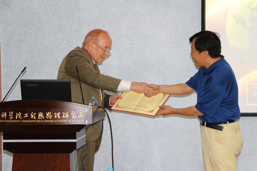 报告会上,Lior教授受聘成为工程热物理研究所客座教授,朱俊强为其颁发了聘书。Lior教授曾主持出版国际能源学报中国能源可持续发展专刊,专程到我国西部地区(新疆、西藏等地)实地考察可再生能源发展状况,并出任由中国工程热物理学会主办的国际能源学术会议科学委员会主席,和研究所分布式供能与可再生能源实验室建立了长期良好的合作关系。