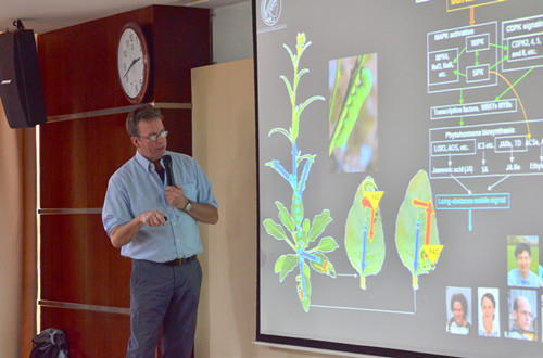 7月8日,Baldwin教授作了题为How a native plant solves life's challenges through a sophisticated use of chemistry的精彩报告。来自研究所各部门以及云南农业大学等兄弟单位的100多名研究人员和研究生参加了该报告会。Ian T. Baldwin教授用幽默风趣的语言,从分子生物学、化学和生态学等不同角度介绍了野生烟草Nicotiana attenuata如何与昆虫Manduca sexta相互作用的多个研究成果,突出了在长期的共进化过程中,该植物所具备的一套非常复杂的抵御昆虫侵食的机制。该报告深入浅出地介绍了植物抗虫研究中最前沿的进展,使与会的听众对该领域的研究产生了极大的兴趣。