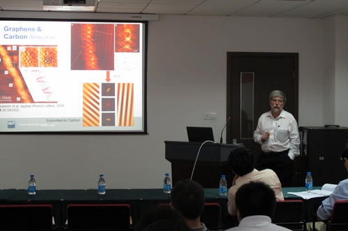 报告会上,John Bell教授首先为研究所师生介绍了昆士兰理工大学的学校概况,然后就薄膜半导体材料气敏传感器设计作了报告,并和与会人员进行了深入交流。薄膜半导体材料的气体传感器工作温度通常高达400oC,为了降低能耗,避免高温操作条件所引发的爆炸危险,研制低温环境下工作的气体传感器成为了近几年的研究热点。John Bell教授利用热蒸镀及电子束蒸镀技术制备出铁掺杂氧化钨薄膜,该材料在150oC时对二氧化氮表现出极高的灵敏度和优异的选择性。此外,John Bell教授还就晶体结构、材料形貌以及热处理过程对传感器灵敏度的影响,如何设计优化材料结构参数以提高传感器的选择性及灵敏度等方面提出了独创性的见解。