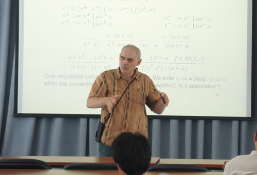 8月30日,巴黎第七大学、法国国家科学中心Pierre-Louis Curien教授应计算机国家科学重点实验室的邀请到中科院软件研究所进行学术交流,并作了题为Mu and mu tilde:two useful combinators的学术报告。报告会由林惠民研究员主持。