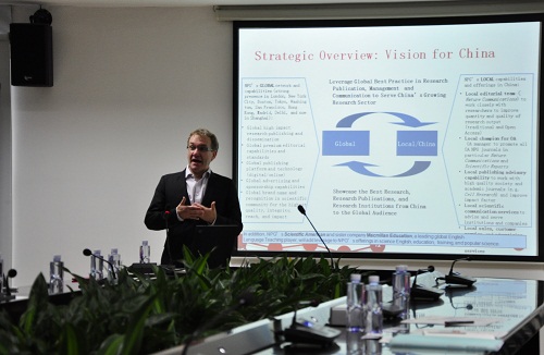 会议交谈中,吕建成对Nick Campbell先生的到访表示欢迎。Campbell介绍了《自然》出版集团在中国大陆地区建立编辑部的情况,Campbell表示,中国科学院的《自然》发表统计(NPI)位居亚太区第二,仅次于日本东京大学,这也反映了中国科研影响力在全球范围内的不断提升。最后,双方就编辑、咨询、广告赞助、培训服务、研讨会等方面展开了交流,并深入探讨了合作编辑《自然》中文版等事宜。