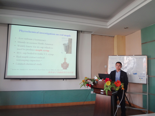 袁涛博士作了题为Discovery of Plant Natural Products with Anti-Diabetic Properties的学术报告。在报告中,袁涛博士围绕Ⅱ型糖尿病先导化合物的发现详细介绍了红枫、石榴花和果黑种草等植物中各类新化合物的分离纯化过程和代表性化合物的结构解析,他还总结了分离到化合物的结构与其生物活性之间的构效关系,推测了其生物合成途径。报告会后,袁涛博士与新疆特有药用资源利用重点实验室的科研人员进行了交流。