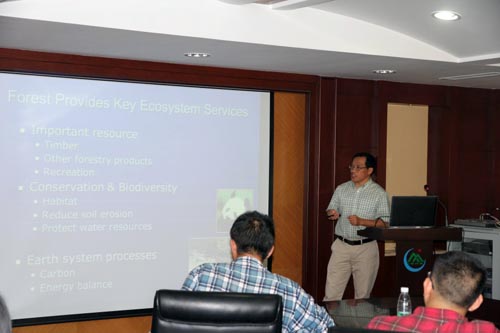 访问期间,黄教授还为科研人员和研究生作了题为Forest disturbance and wetland inundation change analysis using Landsat --Challenges and opportunities的学术报告,系统介绍了美国在采用时间序列Landsat观测数据对森林扰动制图方面的挑战与解决方法、森林各参量如树高、树龄、生物量、结构等参量的遥感获取方法,并对美国切萨皮克湾流域湿地水域范围变化遥感监测技术进行了介绍。