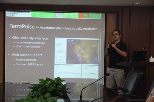 10月10日,Joseph Owen Sexton博士作了题为Introduction to Department of Geographical Sciences, University of Maryland and researches in Global Land Cover Facility的学术报告,主要介绍了美国马里兰大学地理系GLCF(Global Land Cover Facility)平台以及该系在全球土地覆被制图、全球森林覆盖度变化监测、基于时间序列的不透水面变化监测、基于植被指数的物候模拟等方面的研究进展,并同与会者就GLCF未来的发展、土地覆被产品分辨率提高等问题进行了深入的交流与探讨。