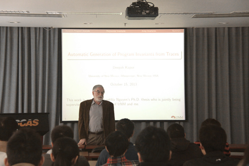 报告中,Deepak Kapur教授针对程序循环不变式的自动生成问题进行了系统介绍。循环不变式生成是形式验证中的关键问题,难度很大。Kapur教授介绍了他和他的博士生Thanh Vu Nguyen提出的一种新的循环不变式生成方法,该方法可发现非线性以及含有数组表达式的循环不变式。报告结束后,与会人员就形式验证和软件工程领域的一些热点问题与Kapur教授进行了深入广泛的交流。