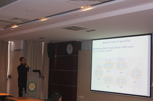 交流会上,王留阳博士向大家介绍了物种生殖隔离及描述其形成的杜布赞斯基-缪勒模型(Dobzhansky-Muller Model)、speciation hypothesis (Wu & Ting, 2004)和有关Genomic divergence during speciation的假说(Nosil & Schulter 2011),以及与性染色体有关的有趣现象large X-effect等内容;着重介绍了所在实验室及其本人目前利用分子生物学和生物信息学方法,以Mus musculus musculus(家养型)和Mus musculus domesticus(野生型)两种啮齿类动物为研究对象,对不同采样地区基因组水平SNP(单核苷酸多态性)进行筛选和比较,以此证明和探讨X性染色体及常染色体上存在的生殖隔离现象;利用GO分析,寻找和发现导致生殖隔离发生的基因。