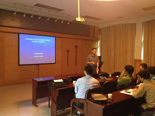 在报告中,牟中林博士介绍了佛罗里达州柑橘面临的严重病害;回顾了当年在四川大学攻读硕士研究生时与吴沿友博士所做的有关植物呼吸代谢的研究,取得了通过HMP途径氧化一分子的葡萄糖-6-磷酸可形成12个NADPH2分子等研究成果。报告最后,牟中林博士主要介绍了其研究团队选用模式植物拟南芥作为研究材料,研究细胞外NAD(P)在植物免疫中的功能,通过实验首次得出细胞外NAD(P)在植物信号转递中起着重要的作用,并阐明了细胞外NAD(P)在植物先天免疫中的潜在重要性。报告结束后,在场师生就报告中感兴趣的内容与牟中林博士进行了热烈讨论。