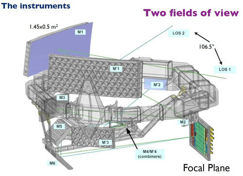 Gaia是欧洲空间局的空间望远镜。它的任务是要绘制一个包含约10亿颗的三维星图,为期5年,它可观测到视星等最暗为20等的天体。这种大规模的恒星观测将给我们提供许多基本观测资料以解决关于银河系形成、结构与演化等多种重要问题。同时,大量的类星体、星系、太阳系外行星和太阳系天体也将被观测。Gaia于2013年11月19日发射升空。