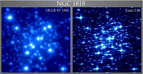 Gaia最新进展,左图为OGLE拍摄的NGC1818,右图为Gaia拍摄的NGC1818