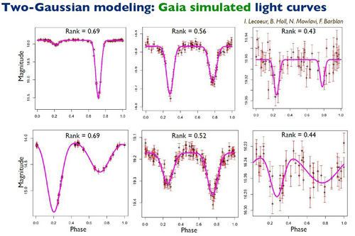 在报告中,Mowlavi博士首先详细介绍了Gaia的基本情况。Gaia卫星是由欧洲空间局(ESA)主导的一颗天体测量卫星,将精确测定暗至20等的全天所有恒星的三角视差、自行、测光、低分辨率光谱以及亮于17等星的中分辨率光谱。其天体测量精度达到10-300微角秒,比90年代的天测卫星依巴谷(Hipparcos)高两个数量级。接着他又介绍了卫星的光学结构,工作原理,巡天方式等技术细节。Mowlavi博士还介绍了Gaia卫星的当前状态。它已经于2013年12月成功发射升空(参见http://sci.esa.int/gaia/),目前正在进行测试巡天。下图是测试期间拍摄的疏散星团NGC1818同地面望远镜图像的对比,可以看到Gaia的空间分辨本领远超地面,和哈勃望远镜的相近。最后,介绍了他领导的变星小组的工作进展。他们预计在Gaia五年的观测周期内发现各种类型的变星近百万颗。