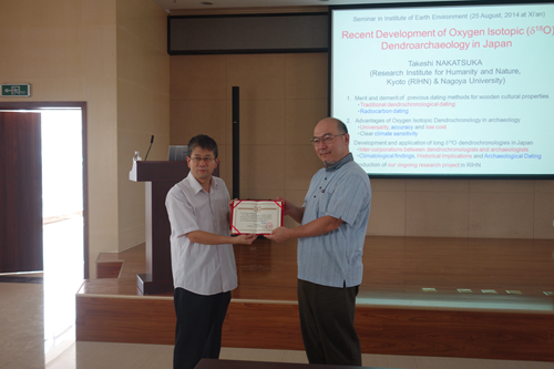 期间,Nakatsuka教授分别以Oxygen Iotope Dndrochronology–Its Bckground, Dvelopment and Aplications和Recent Dvelopment of Oygen Iotopic Dndroarchaeology in Japan为题进行学术报告。报告中,Takeshi Nakatsuka教授着重就树轮氧同位素研究的背景、发展及应用作了详细的介绍,同时展示了近年来在日本开展的一系列树轮氧同位素年代学及考古学研究成果,对于未来气候的预测和人类社会的发展具有重要的指示意义。刘禹代表研究所向Takeshi Nakatsuka教授颁发了客座教授荣誉聘书。