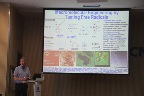 Matyjaszewski教授作了题为Macromolecular Engineering by Taming Radicals的学术报告。他介绍了使用ATRP催化剂体系控制自由基聚合的原理与技术关键,着重指出通过ATRP技术可以实现高分子化学成分与拓扑结构的多样化与精确化,进而实现高分子性能的多样化,还谈到了ATRP技术在分子刷摩擦润滑技术、有机硅密封胶、高性能涂料、碳纤维、抗污损表面、自愈合材料、基因输送材料、多孔碳材料、光电高分子等领域的应用,最后简介了他们课题组与Akzo Noble, Dow Chemical, PPG等国际一流公司的合作开发的产品。会上,在场的科研人员就研究内容以及在科研过程中遇到的困难,向Matyjaszewski教授请教。