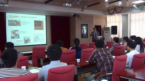 Mallouk在强磁场科学中心副主任田明亮研究员的陪同下,参观了稳态强磁场实验装置及材料科学部各实验室,对强磁场科学中心的科研环境、实验条件、人才队伍等给予了很高的评价。访问期间,Mallouk同中心的有关科研人员就相关课题进行了探讨,并同部分研究生进行了交流,耐心地回答了他们的问题。9月24日下午,Mallouk的学术报告《一维纳米材料:探索模板生长纳米线中的介观现象》吸引了几十位来自强磁场科学中心、固体物理研究所等单位的科研人员和研究生前来聆听。报告会上,Thomas E. Mallouk教授还与听众就有关纳米马达和机器人在未来疾病治疗上的应用和安全问题进行了探讨和互动。