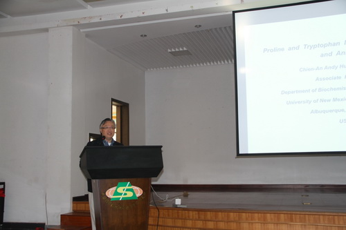 Chien-An Andy Hu以Proline and Tryptophan Metabolism in Human and Animal为主题,介绍了其研究团队在氨基酸代谢与癌细胞凋亡/自嗜调控、抗癌药物筛选等方面的最新研究进展。该所畜禽健康养殖研究中心科研人员就动物脯氨酸和色氨酸代谢通路调控与生理功能、细胞凋亡与自嗜相互调节信号通路、脯氨酸和色氨酸在动物饲料中的应用前景等方面,与Hu进行了热烈讨论和深入交流,并详细制定了近期的合作研究与人员交流计划。之后,在孔祥峰博士陪同下,Hu参观了该所重点实验室和动物与作物实验楼。Hu对所相关研究基础和科研条件给予了高度评价,并对今后双方的科研合作充满信心。