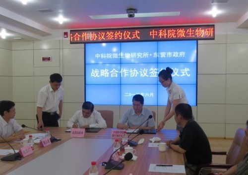 东营市副市长杨同柱等领导以及微生物所代表参加了签约仪式。东营市代表首先介绍了东营国家农业科技园区的建设情况以及东营市食药用菌产业发展情况,指出东营市食药用菌产业发展迅速,年产已达30余万吨,正处于由追求数量向追求质量转变的关键时期。庄文颖、刘双江分别致辞,均表示本次将是双方共赢的重要合作;刘杏忠介绍了国家重点实验室的学科布局,以及在食药用菌方面具备合作可能的具体研究方向。与会双方均表示对本次合作充满信心。