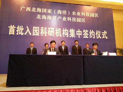 9月12日,广西北海国家(海洋)农业科技园区暨北海海洋产业科技园区首批入园科研机构集中签约仪式在广西北海市举行。来自中科院南海海洋研究所、中国水产科学研究院、国家海洋局第一海洋研究所等11家科研机构参加签署仪式。所党委书记黄良民等出席签约仪式。