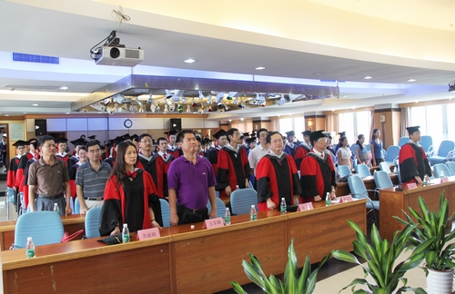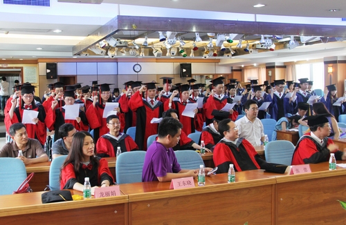张偲、黄良民、龙丽娟以及部分导师为获得博士和硕士学位的研究生颁发学位证书、扶正流苏。