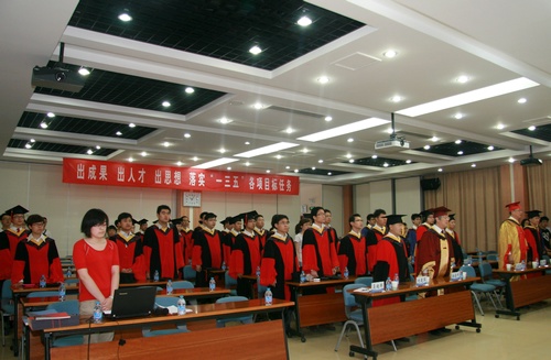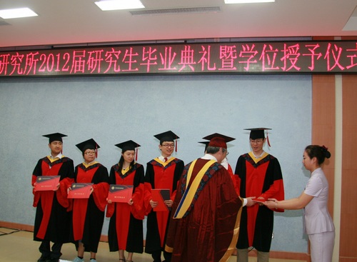 10点,毕业典礼在庄严的国歌声中拉开帷幕,朱俊强首先宣读了2012年获得博士、硕士学位的毕业生名单,在全场热烈的掌声中,50余位身着学位服的毕业生满怀收获的喜悦次第登台,从徐建中院士及各位导师手中接过学位证书。