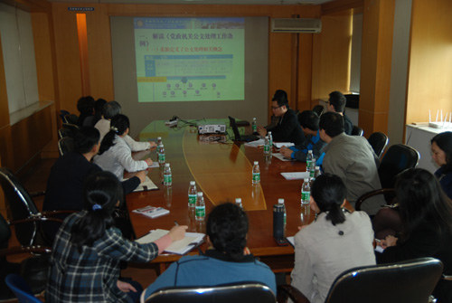 培训由党政人教处副处长向银花主持。她首先介绍了本次培训的背景、目的和意义,希望大家认真学习公文业务知识,共同提高研究所公文管理水平。随后,文书管理员谢舜源作研究所公文处理专题讲座,从公文的概念、种类、格式、行文规则和写作要求等多个方面进行了讲解,介绍了新出台的《党政机关公文处理工作条例》和《中国科学院公文处理办法》,以两篇公文案例为经典教材为大家列举了公文管理中的一些问题,并介绍了中科院ARP内部签批件的范畴、功能和流转。最后,与参加培训的同事进行现场互动,一一解答了提出的一些问题。培训后,档案室何淑宁根据以往经验总结了各职能部门文书在归档过程中存在的问题,并提出了相应的改进建议。