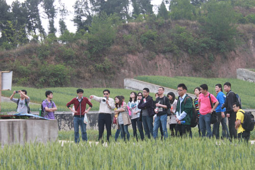 盐亭站是国家级野外台站,代表了中亚热带紫色土丘陵区典型农业生态系统,长期开展紫色土土壤肥力、水土保持、环境演变与农业生态等领域的试验观测研究。研发的生态农业与小流域生态恢复技术如“桤柏混交林模式”、“聚土免耕”、“粮经弹性种植”等技术在长江上游紫色土丘陵区广泛推广,取得了显著的生态、经济和社会效益。同学们在程训强的带领和介绍下,实地参观了盐亭站的自动气象辐射观测站、农地综合观测场、集水区测流站、坡地养分平衡场和紫色母岩风化试验场等野外设施,了解了室内的原子吸收分光光谱仪、气相色谱仪和显微镜等先进仪器的性能和操作流程,对盐亭站的科研工作有了切身了解。