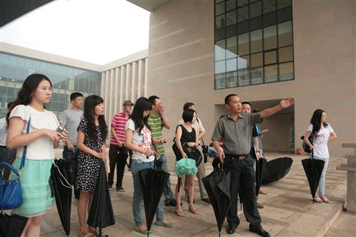 各大中央媒体的记者们顶着蒙蒙细雨,参观了位于雁栖湖校区西区的图书馆、教学楼、学园楼、学生公寓、运动场等主要建筑,对“育人为本”的设计理念和舒适、实用的校园环境给予了高度评价,并期望即将入学的新生能在启用的西区校园中专心学习、快乐生活。