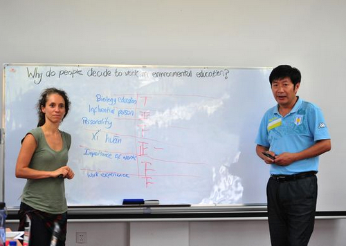最后,两位学员代表骆嘉航、耿艳红分别发言,总结了培训期间他们丰富的学习收获和珍贵的友情收获,台下学员们离别在即,动容落泪。授课老师代表王西敏发言,鼓励大家继续“磨砺思维的牙齿”,不因困难而退却,努力将所学用于各自的科普实践中去。陈进总结了培训班的得失,感谢学员们的全情投入,使得培训班能够成功举办,感谢园内职工们辛勤的后勤保障,同时希望所有学员回到各自的工作岗位上后,能不忘记这里所学到的东西,学以致用,他期待着,不断地在国内、国际的学术会议上、专业期刊上,看到学员们的环境教育研究成果,这才是此次培训班真正成功的标志。