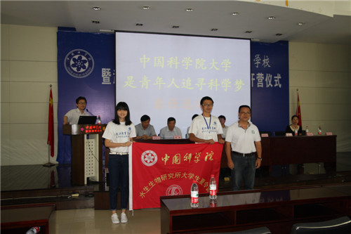 在开营仪式上,院属在汉六个培养单位的领导向本所营员代表授予夏令营营旗。