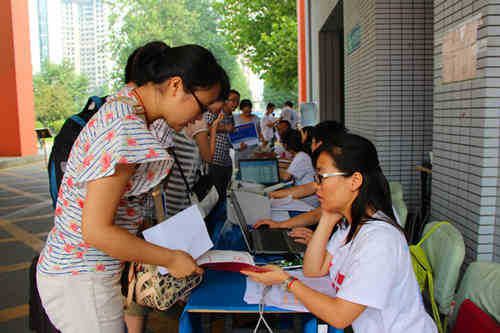 早上不到7点,就已经有中丹学院工作人员来到报到地点,接待到达时间较早的新生。8点,资格审核、信息收集、党团事务、户籍事务、教学工作等五个工作台搭设完毕,所有工作人员准备就绪,准时开始为新生办理报到手续。