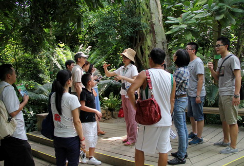 科普讲解员技能讲堂上,华南植物园柯萧霞老师主讲了《科普讲解员的服务礼仪及讲解技巧》专题, 她的讲解条理清晰又十分有幽默感,道理深入浅出。她列举了一系列事例,比如讲解该注意或必须提到的内容、何时在某个场景内讲什么主题或在语言表达技巧的注意事项,传授给大家多年来的经验。讲解中还加入了互动体验表演,植物园科普导游的示范讲解,巧妙的导游技巧,适度的语速、语音及轻快的语调,让大家如临其境,整个课堂顿时气氛活跃生动起来,精彩的讲解使现场掌声不断。通过讲解培训,大家领悟到有助于日常讲解的方法和技巧。随后,大家一起进入各专类园及温室群景区进行现场示范讲解以及心得交流。