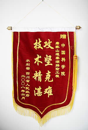 7月3日,水利部、四川省人民政府将一面绣有“攻坚克难 技术精湛”的锦旗送给中国科学院,感谢中科院在唐家山堰塞湖排险工程中做出的重要贡献。此前,水利部已向中科院发出感谢信,全文如下: