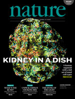 本期封面所示为一个完整肾脏细胞器的拼接式免疫荧光扫描图,它显示了其结构的复杂性,实际尺寸为5.7mm×6.4 mm。胚胎中人类肾脏的发育依赖于两种不同的干细胞类型:一种生成收集管,另一种生成功能性肾单位。Melissa Little、Minoru Takasato及同事以前发现, “人多能干细胞”(hPSCs)能分化成这两种类型的祖细胞。他们现在识别出了不仅诱导这些结构,而且诱导周围细胞类型(包括小间隙和血管)所需的信号条件。采用这种方法,他们培养出了能重现胚胎肾脏功能区域化的肾脏细胞器。这些细胞器中所达到的组织复杂性和功能化程度还不能与一个正常的肾脏相比,但与正常的人类胚胎肾脏相同。重要的是,它们提供了证明自己在药物毒性筛选、在模拟遗传性肾病方面所具有潜力的证据,或许还为细胞疗法提供了特定的肾脏细胞类型。