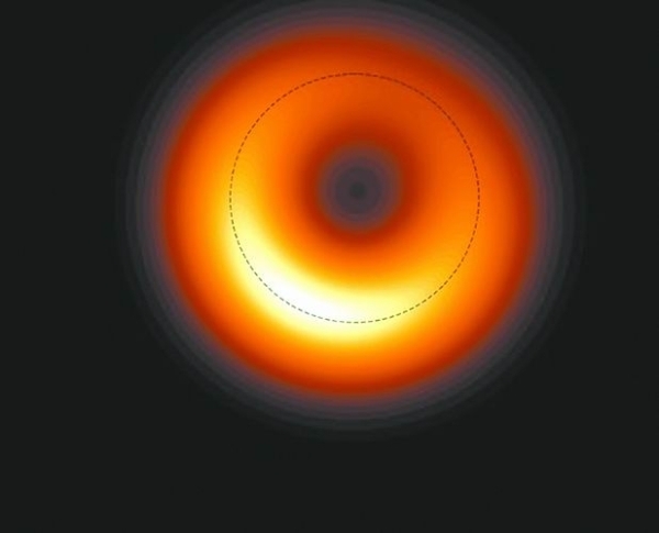 图片显示,光环的一边似乎比另一边更亮。落入空隙的物质在黑洞赤道外高速旋转,形成天体物理学家所说的吸积盘。在一定程度上,这种不平衡的光环与多普勒效应有关:在朝向观察者旋转的一侧,物质的运动增强了辐射,使其看起来更亮;相反的情况发生在另一侧。