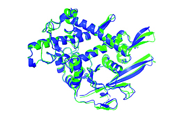 图中蓝色为计算机预测的蛋白质结构,绿色为实验验证结果,二者相似度非常高。图片来源:DeepMind