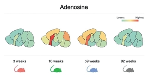 来自小鼠大脑代谢组学图谱的数据截图显示了大脑区域中腺苷随年龄的分布。 图片来源:加州大学戴维斯分校