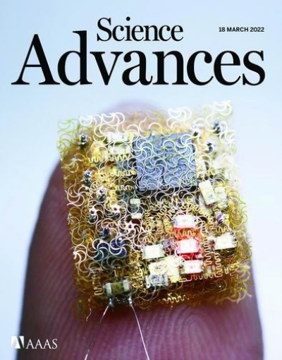最新一期《科学进展》封面展示了一个小型化的可伸缩、可穿戴的柔性电子器件。