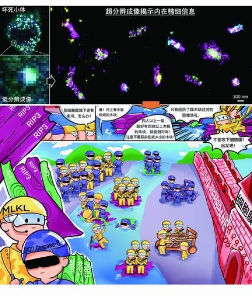 研究人员找到了一个精准的观察利器——STORM,并且用这一显微镜实现了对“坏死小体”在细胞中如何精准处理复杂信号进而决定细胞死亡命运的观察。他们发现死亡细胞中的“坏死小体”由初始点团样结构演化为规则的棒状结构的组装模式,并且在该规则棒状结构中呈现出明显的由RIP1/RIP3组成的马赛克状分布。当MIKL四个以上成团,找到四块以上RIP3木块,就能越过“坏死小体”河流,进而靶向细胞膜,导致细胞死亡。