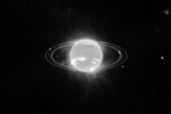 在詹姆斯·韦布太空望远镜拍摄的红外图像中,海王星的光环闪耀着明亮的光芒。图片来源:NASA、ESA、CSA、STScI