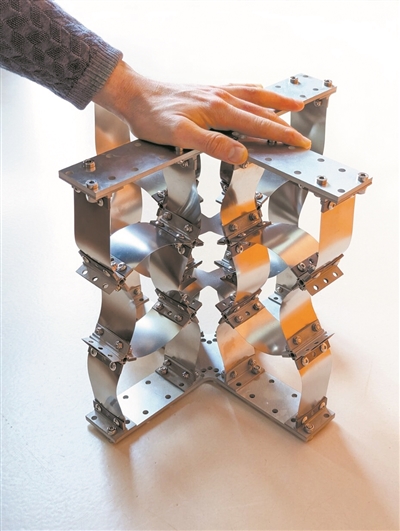 论文作者、阿姆斯特丹大学的戴维·戴克斯特拉解释说,他们取得突破的诀窍是使用弯曲的材料,比如薄金属板。当以巧妙的方式组装在一起时,由这种弯曲的金属板制成的结构可以很好地吸收振动,同时也能保持材料的硬度。此外,板不需要很厚,因此材料可以保持相对“轻盈”。