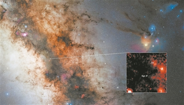 图像显示了新发现的双星D9的位置,它正围绕人马座A*运行。图片来源:欧洲南方天文台