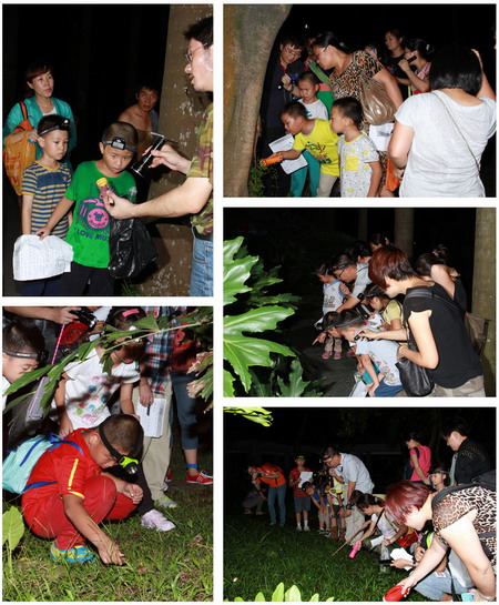 华南植物园优越的自然生态环境是各种动物们的欢乐家园,生长着两栖纲、爬行纲、软体动物、昆虫纲、蛛形纲、鸟纲等数量庞大的各种不同动物,是开展夜间自然观察的不二场地。夜观科普在活动环节和活动路线的设计上都融入了华南植物园科普辅导员的诸多心血。科普活动开始前的理论知识学习、夜间夜行动物和感夜植物的随机交替出现、阴暗处动物及光亮处动物品种的对比、观察内容一环扣一环不间断出现等特征都使夜观科普活动期间同学们的好奇心得到充分的调动,取得良好的教学效果。邀请的科普老师不仅是各学校的专业老师,同时是经常深入野外进行观察的自然爱好者,其实践教学不仅注重“专业”,更注重“科普”效果。他们扎实的专业知识、诙谐幽默的科普讲解、有趣的科普互动达到了良好的教学效果,他们对观察大自然的爱好与执着也带出了更多的小粉丝。