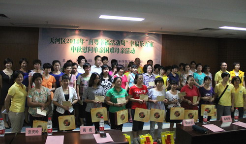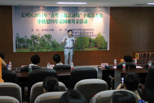 9月4日,“幸福乐万家”2014年中秋慰问单亲特困母亲科普活动在风景秀丽的中国科学院华南植物园举行。天河区委常委、组织部部长黄彪,天河区副区长饶洁怡,天河区妇联主席张庆玲,华南植物园园艺中心执行主任蒋厚泉等,以及来自广州市单亲困难母亲代表100余人参加活动。此次活动旨在进一步落实关爱帮扶机制,深化关爱行动,营造热烈喜庆、文明和谐的社会氛围,在这金风送爽、桂花飘香的中秋前夕,帮扶慰问单亲特困母亲,让她们过上一个欢乐喜悦的中秋节。