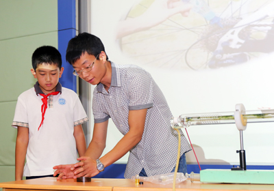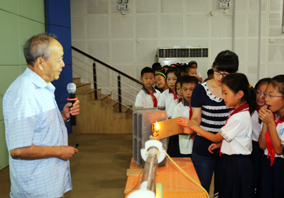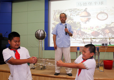 10时,沙国河院士在大家的掌声中走上讲台,与小朋友们一同体验“奇妙的科学实验”。静电起电机上,小朋友们亲自体验一把“怒发冲冠”的感觉,大呼“过瘾!刺激!”;大家亲眼目睹了激光的力量,看二氧化碳激光器是怎样发射肉眼看不见的红外光,瞬间将木头点燃;沙院士还特别带去了“马德堡半球”装置,将两块有机玻璃中间抽成真空,让学生们自己动手看能否将其拉开,亲身感受大气压力的存在……
