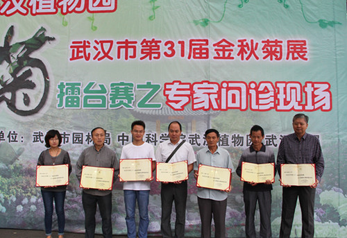 本次活动是武汉市斗菊擂台赛的前期活动,武汉植物园联合武汉市园林局,邀请了武汉市有名的十位菊花专家担当市民养花的顾问团,这十位专家分别是中科院武汉植物园菊花博士张莉俊;“中国菊艺大师”李建祥;全国菊展金奖得主朱秀珍、黄八斤、辛高炉、刘庆东、段辉、丁建路;全国菊展银奖获得者王宏言;湖北省菊花品种大赛一等奖得主林建民。十位菊花专家长期从事菊花栽培、育种等工作,有着丰富的养菊经验。活动伊始,武汉植物园向十位专家发放了聘书,正式聘请十位菊花专家成为武汉市斗菊擂台赛活动的养菊导师。活动前期本来征集了30个养菊家庭结对子,由于市民的热情参与,现场临时增加到36个样本家庭,经过主办方研究决定,十位养菊导师现场和36个样本家庭结对子。