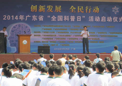 9月19日,由广东省科协、广东省教育厅、广东省委宣传部、广东省环保厅等单位共同主办的2014年广东省“全国科普日”活动启动仪式在广州第17中学开幕。广东省的科普教育基地代表、省级学会专家和科技工作者、科普剧表演队、科普志愿者、新闻媒体记者及在校师生2000多人参加了活动。本次活动围绕“创新发展,全民行动”主题,以“创新引领未来、创新改变生活、创新在我身边、创新圆我梦想”为主线,形式上采取现场展示、演示、互动和线上体验相结合的方式,让科技成果惠及广大公众,为提高公民科学素质、建设和谐社会做出贡献。