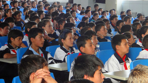 这4所中学内初班的同学主要来自吐鲁番、喀什和农三师,绝大多数是少数民族农牧民的孩子,从小就生活在边远、荒漠化严重的地区。王雪芹副研究员和徐峰博士用极为通俗语言和大量的图画版面主讲了“荒漠化及防治”和“雪豹探秘——保护荒漠动物从雪豹开始”的科普报告。一张张淳朴的脸庞、一双双渴求知识的眼睛紧紧盯着大屏幕。