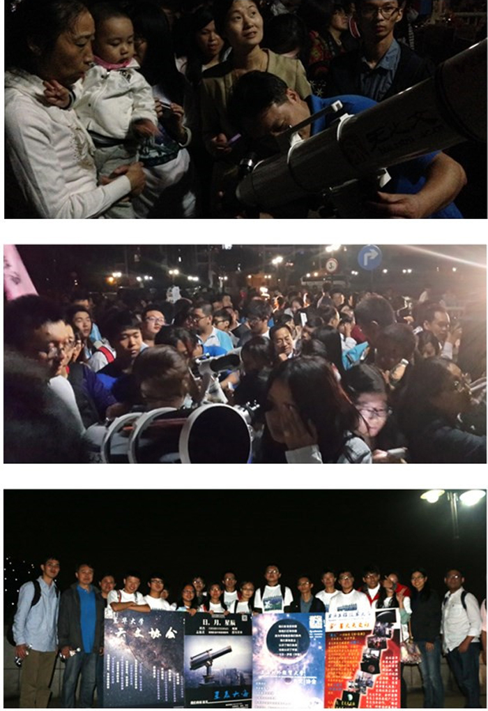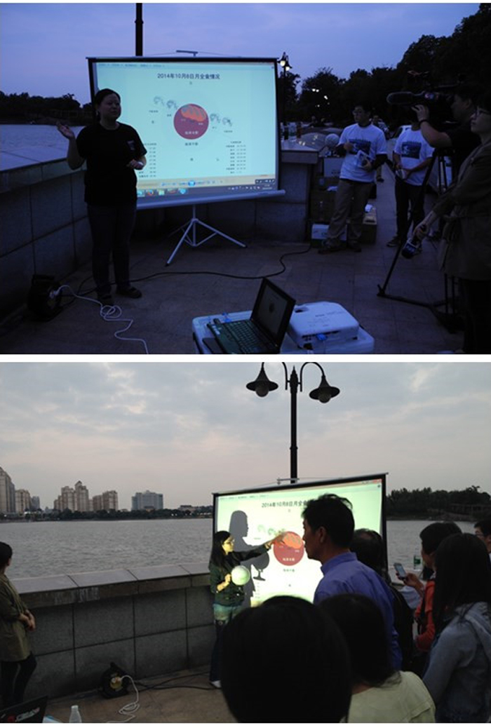 17点左右,活动现场就来了很多人,焦急地等候着月亮从云层中露脸。观众在等待月亮突破云层的过程中,一起四次高呼“月亮月亮快出来”。终于,18点30左右,大家看到了月亮的一角,可惜不一会它又被淹没在云层中。直到19点钟左右,月亮附近的云层才真正散去,现场的月全食观测才真正地拉开成功的帷幕。大家排着队,等着通过望远镜看到月亮;志愿者指导观众用手机通过望远镜拍下红月亮留念。最震撼人的还是19点到19点20左右的“红月亮”,有位老人说,“以前小时候看到月亮不见了,真的以为是天狗吃月亮,大家还都很害怕。现在知道了,这就是月全食,一种特殊的自然现象而已。”19点24分,“红月亮”的东侧边缘出现亮点,慢慢地,月亮慢慢变胖,1个小时之后,大家又看到了空中悬挂着那个圆圆的月亮。